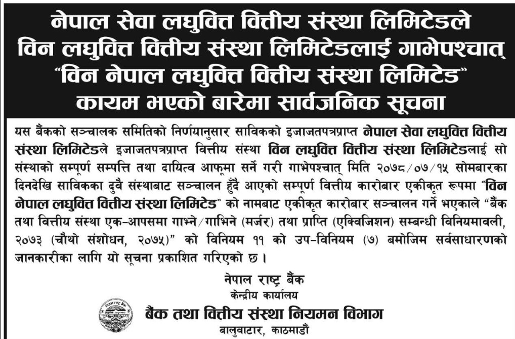 साविकको इजाजतपत्र प्राप्त नेपाल सेवा लघुवित्तले विन लघुवित्तलाई सो संस्थाको सम्पूर्ण सम्पत्ति तथा दायित्व आफूमा सर्ने गरी गाभेपश्चात् कार्तिक १५ गते सोमबारका दिनदेखि साविकका दुवै संस्थाबाट सञ्चालन हुँदै आएको सम्पूर्ण वित्तीय कारोबार एकीकृत रूपमा “विन नेपाल लघुवित्त वित्तीय संस्था लिमिटेडको नामबाट एकीकृत कारोबार सञ्चालन गर्न लागिएको जनाएको छ ।