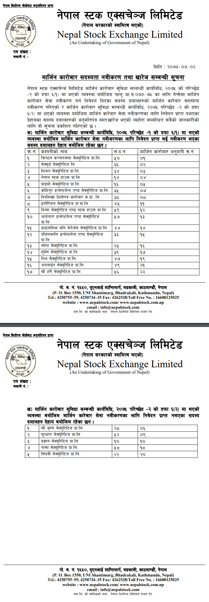 स्टक एक्सचेन्जले हिजो एक सूचना प्रकाशित गर्दै ब्रोकर नम्बर २८को श्री कृष्ण सेक्युरिटिज, ब्रोकर नम्बर ५२ को सुन्धारा सेक्युरिटिज, ब्रोकर नम्बर १० को प्रज्ञान सेक्युरिटिज, ब्रोकर नम्बर ५८ को नासा सेक्युरिटिज र ब्रोकर नम्बर २२ को सिप्रवी सेक्युरिटिजको मार्जिन कारोबार सुविधा अनुमति पत्र नविकरण नभई खारेज भएको जनाएको छ ।