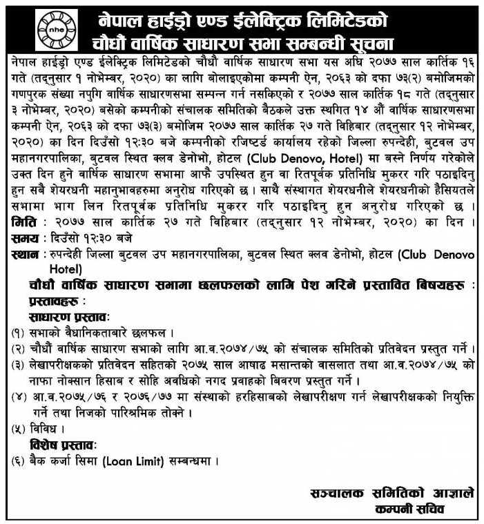 काठमाडौं । नेपाल हाइड्रो एण्ड इलेक्ट्रिक लिमिटेडले कात्तिक २७ गते वार्षिक साधारण सभा गर्ने भएको छ । कम्पनीको सञ्चालक समितिको बैठकले गरेको निर्णय अनुसार कम्पनीको चौधौँ वार्षिक साधारण सभाको निर्णय गरेको हो । उक्त सभा बुटवलस्थित क्लब डेनेभो होटल, रूपन्देहीमा दिउँसो १२।३० बजेबाट सुरू हुने जनाएको छ ।