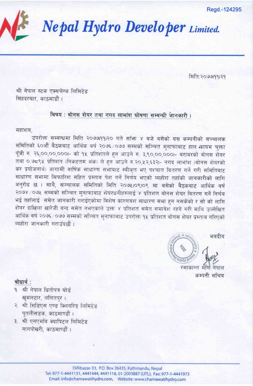 काठमाडौं । नेपाल हाइड्रो डेभलपरले लाभांश प्रस्ताव गरेको छ । कम्पनीको फागुन २० गते बसेको संचालक समितिको बैठकले गरेको निर्णयानुसार आर्थिक वर्ष २०७६/७७ को संचित मुनाफाबाट कम्पनीका शेयरधनीहरुलाई १५ प्रतिशत बोनश शेयर र ० दशमलव ७८९५ प्रतिशत नगद लाभांश (कर प्रयोजन) गरी कुल १५ दशमलव ७८९५ प्रतिशत लाभांश वितरण गर्ने प्रस्ताव गरेको हो ।