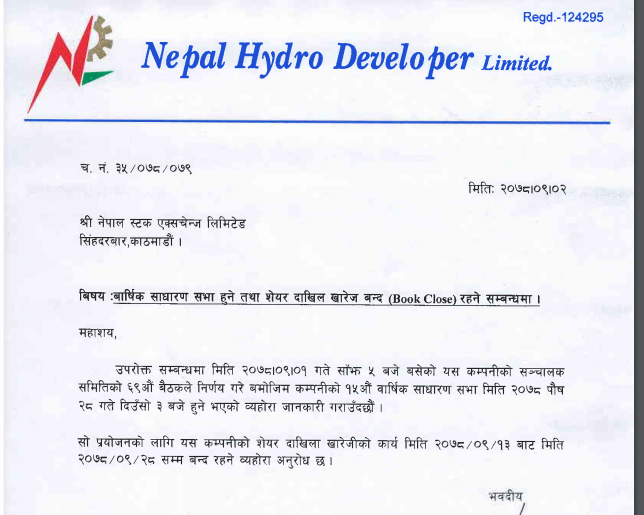 कम्पनीले पुस २८ गतेको लागि साधारणसभा आह्वान गरेको छ। कम्पनीले साधारणसभा प्रयोजनको अल्गी पुस १३ गतेदेखि २८ गतेसम्म बुक क्लोज गर्ने निर्णय गरेको छ । पुस १२ गतेसम्म कायम शेयरधनीले मात्र सभामा भाग लिन र प्रस्तावित लाभांश पाउछन् ।