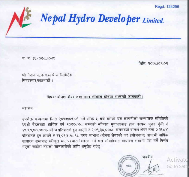 काठमाडौं । नेपाल हाइड्रो डेभलपर लिमिटेडले लाभांश घोषणा गरेको छ। कम्पनीको बिहिबार बसेको संचालक समितिको बैठकले आर्थिक वर्ष ७७/७८ को मुनाफाबाट आफ्ना शेयरधनीलाई वितरण गर्ने लाभांश प्रस्ताव गरेको हो ।