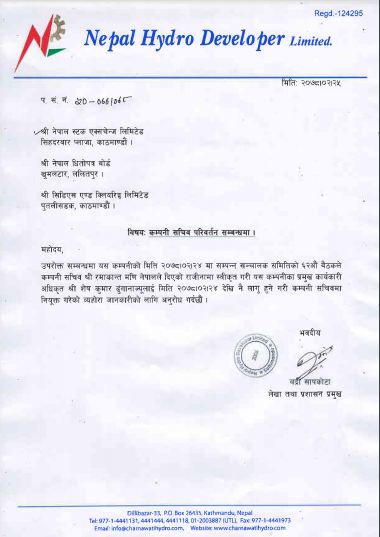 कम्पनीको जेठ २४ गते सोमबार बसेको संचालक समितिको बैठकले कम्पनीको सचिव रमाकान्त मणि नेपालको राजीनामालाई स्वीकृत गर्दै प्रमुख कार्यकारी अधिकृत ढुंगानालाई कम्पनी सचिवमा नियुक्त गरेको जनाएको छ ।