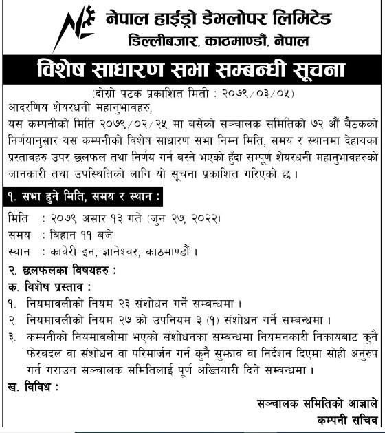 काठमाडौं । नेपाल हाइड्रो डेभलोपर लिमिटेडको विशेष साधारणसभा आज असार १३ गते हुँदैछ । कम्पनीको जेठ २५ गते बसेको सञ्चालक समितिको बैठकले उक्त सभाको मिति तय गरेको हो ।