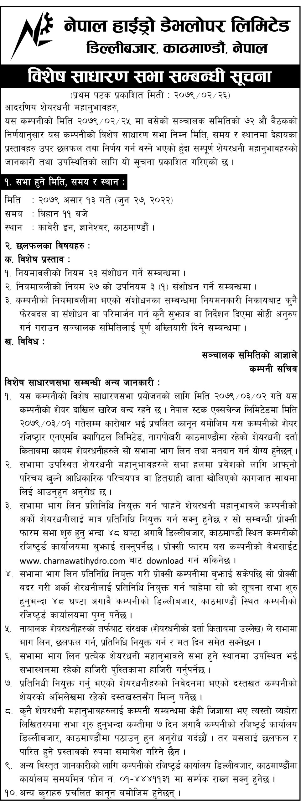 काठमाडौं । नेपाल हाइड्रो डेभलोपरले असार १३ गते विशेष साधारण सभा गर्ने भएको छ । कम्पनीको जेठ २५ गतेको सञ्चालक समितिको बैठकले कावेरी इन ज्ञानेश्वर, काठमाडौंमा बिहान ११ बजे सभा गर्ने निर्णय गरेको हो ।