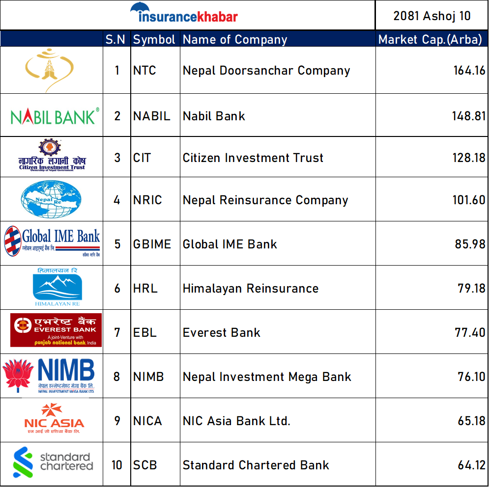 दोश्रोमा नबिल बैंक लिमिटेडको सर्वाधिक बजार पूँजीकरण रहेको छ । कम्पनीको १ खर्ब ४८ अर्ब बजार पूँजीकरण रहेको छ। त्यस्तै तेश्रोमा नागरिक लगानी कोषको सर्वाधिक बजार पूँजीकरण रहेको छ । कम्पनीको १ खर्ब २८ अर्ब बजार पूँजीकरण रहेको छ।