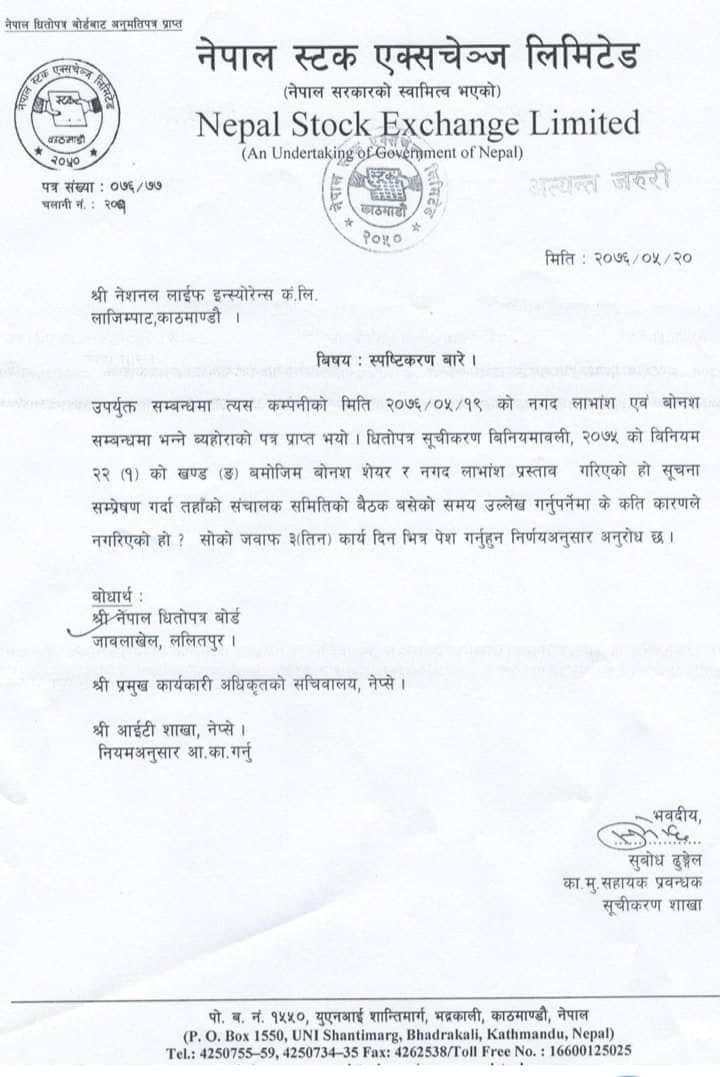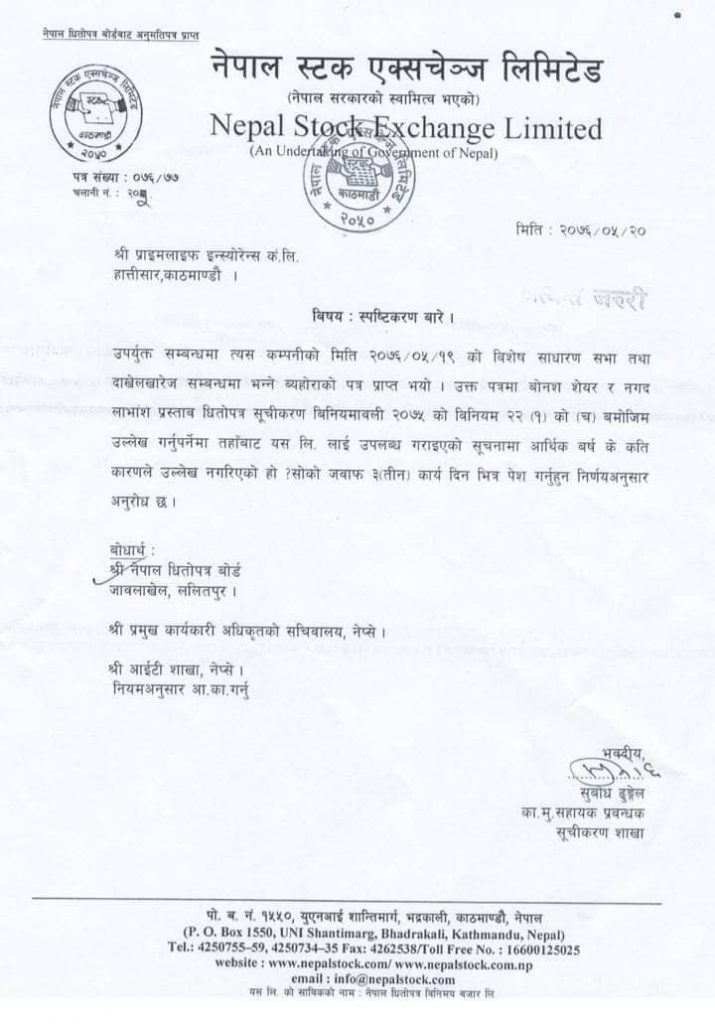 प्राईम लाईफ इन्स्योरेन्स कम्पनीले हिजो नेप्सेलाई दिएको सूचनामा विशेष सधारण सभाको मिति घोषण तथा उक्त विशेष सधारणसभामा प्रस्तुत हुने प्रस्तावमा बोनश शेयर तथा नगद लाभांश वितरण गर्ने व्यहोरा उल्लेख हुँदा कुन आर्थिक वर्षको सञ्चालन मुनाफाबाट बोनस शेयर दिन लागेको हो । सो कुरा उल्लेख नगरेको फेला परेपछि तीन दिनभित्र जवाफ पेश गर्न नेप्सेले प्राईम लाईफलाई पत्र काटेको हो ।