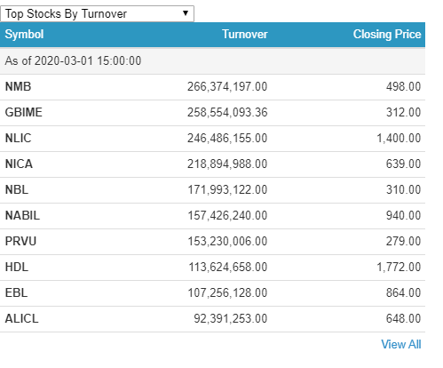 आज दिनभरिमा १ सय ८३ कम्पनीको १ करोड २५ लाख १७ हजार कित्ता शेयर किनबेच हुँदा ४ अर्ब ८४ करोड ७४ लाख ३७ हजार रुपैयाँको कारोबार भएको छ । सबैभन्दा धेरै एनएमबि बैंकको २६ करोड ६३ लाख रुपैयाँको कारोबार भएको छ ।