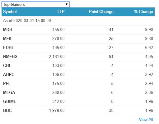 आज सबैभन्दा धेरै मितेरी डेभलपमेन्ट बैंक र मञ्जुश्री फाइनान्सका लगानीकर्ताले सबैभन्दा धेरै ९ प्रतिशतका दरले कमाएका छन् भने बोटलर्स नेपालका लगानीकर्ताले सबैभन्दा धेरै ९ दशमलव ९९ प्रतिशतका दरले गुमाएका छन् ।