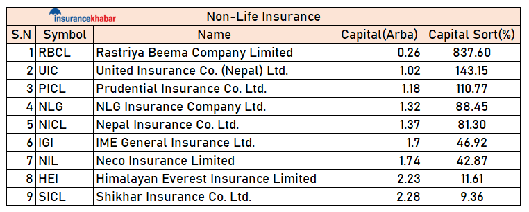 नेप्सेमा कारोवार हुने ९ निर्जीवन बीमा कम्पनी मध्ये सरकारी लगानी रहेको राष्ट्रिय बीमा कम्पनीको पुँजी सबै भन्दा कम छ । कम्पनीको चुक्ता पुँजी २६ करोड रहेको छ । कम्पनीले सर्वाधिक ८३७ दशमलव ६० प्रतिशतले पुँजी वृद्धि गर्नु पर्ने देखिएको छ ।