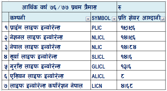 प्राइम लाइफको प्रति शेयर आम्दानी सबैभन्दा धरै १९ रुपैयाँ ९६ पैसा रहेको छ भने लाइफ इन्स्योरेन्स कर्पोरेशन नेपालको प्रति शेयर आम्दानी सबैभन्दा थोरै ४ रुपैया ६८ पैसा रहेको छ। प्रतिशेयर आम्दानीलाई वार्शिकरण गरिएको छ।