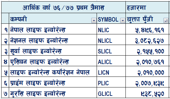 ७ जीवन बीमा कम्पनीहरुमध्ये नेपाल लाइफ इन्स्योरेन्सको चुक्ता पूँजी सबै भन्दा धेरै छ। नेपाल लाईफाको चुक्ता पूँजी ५ अर्ब ४९ करोड रहेको छ। गुराँस लाइफ इन्स्योरेन्सले मात्र आवश्यक २ अर्ब चुक्ता पुँजीको लक्ष्य हासिल गरेको छैन।  गुराँस लाइफ इन्स्योरेन्सको चुक्ता पूँजी ९३ करोड ८५ लाख रुपैयाँ रहेको छ।