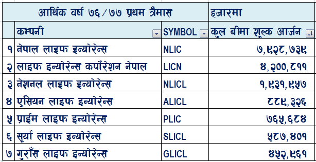 (नोट : आर्थिक वर्ष ७६/७७को प्रथम त्रैमासको कुल बीमा शुल्क आर्जन समावेश गरिएको)