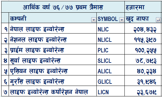 सबैभन्दा धेरै खुद नाफा गर्ने जीवन बीमा कम्पनीमा नेपाल लाइफ इन्स्योरेन्स कम्पनी पर्छ। कम्पनीले प्रथम त्रैमास सम्म २०  करोड ४४  लाख रुपैयाँ खुद नाफा गरेको छ त्यस्तै सबैभन्दा थोरै खुद नाफा गर्ने कम्पनी भनेको लाइफ इन्स्योरेन्स कर्पोरेशन नेपाल रहेको छ। लाइफ इन्स्योरेन्स कर्पोरेशन नेपालले २  करोड ३६  लाख खुद नाफा गरेको छ।