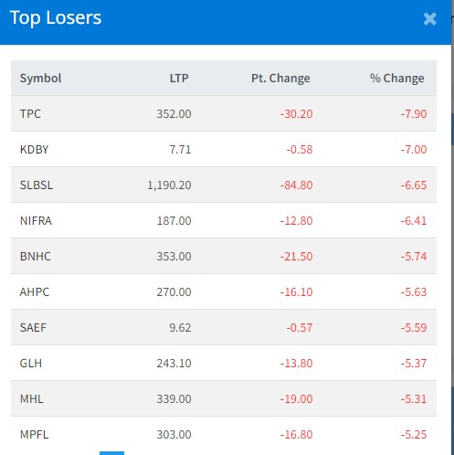 आज सबैभन्दा धेरै तेह्रथुम पावर कम्पनीका लगानीकर्ताले गुमाएका छन् । कम्पनीका लगानीकर्ताले ७ दशमलव ९० प्रतिशतका दरले गुमाएका छन् ।