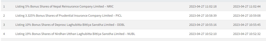 नेप्सेमा डिप्रोक्स लघुवित्तको १० प्रतिशतले हुन आउने १३ लाख ८७ हजार ४ सय ९८ दशमलव ३३२८ कित्ता बोनश शेयर, निर्धन उत्थान लघुवित्तको १९ प्रतिशतले हुन आउने ४१ लाख ७० हजार ५ सय ४७ दशमलव ५ कित्ता बोनश शेयर र प्रुडेन्सियल इन्स्योरेन्सको ३.३२५ प्रतिशतले हुन आउने ३ लाख ९४ हजार ३ सय ९२ कित्ता र नेपाल पुनर्बीमा कम्पनीको ५ प्रतिशतले हुन आउने ५८ लाख २५ हजार कित्ता बोनश शेयर सुचिकृत भएको हो ।