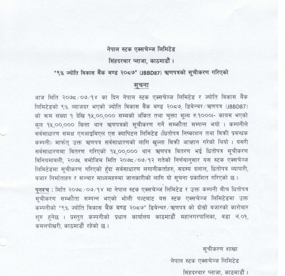 काठमाडौं । ज्योति विकास बैंकको ऋणपत्र नेपाल स्टक एक्सचेञ्जमा सूचिकृत भएको छ । कम्पनीको १५ लाख कित्ता ऋणपत्र नेप्सेमा सूचिकृत भएको हो । ९ प्रतिशत ज्योति विकास बैंक बण्ड २०८७ डिबेञ्चर नामक ऋणपत्र सुचिकृत भएको हो ।