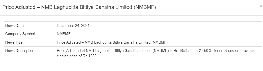 एनएमबि लघुवित्तको २१ दशमलव ५० प्रतिशत बोनश शेयरपछि मुल्य समायोजन भएको हो । मूल्य समायोजनपश्चात एनएमबि लघुवित्तको १ हजार ५३ रुपैयाँ ५० पैसा कायम भएको छ । कम्पनीको अघिल्लो कारोबारको दिनको अन्तिम शेयर मुल्य १२ सय ८० रुपैयाँलाई आधार मानेर मुल्य समायोज गरेको हो ।