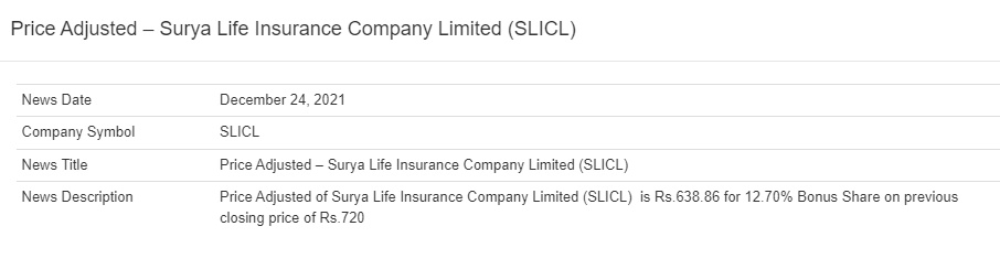 सूर्या लाइफको १२ दशमलव ७० प्रतिशत बोनश शेयरपछि मुल्य समायोजन गरेको हो । कम्पनीको शेयर मुल्य ६३८ रुपैयाँ ८६ पैसा कायम भएको छ। कम्पनीको अघिल्लो कारोबारको दिन अन्तिम शेयर मुल्य ७२० रुपैयाँलाई आधार मानेर मुल्य समायोजन गरेका हो ।