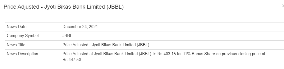 ज्योति विकास बैंकको ११ प्रतिशत बोनश शेयरपछि नेप्सेमा मुल्य समायोजन भएको हो। ज्योति विकास बैंकको शेयर मूल्य ४०३ रुपैयाँ १५ पैसा कायम भएको छ । कम्पनीको अघिल्लो कारोबार दिन ४४७ रुपैयाँ ५० पैसाको आधारमा मुल्य समायोजन गरेको हो ।