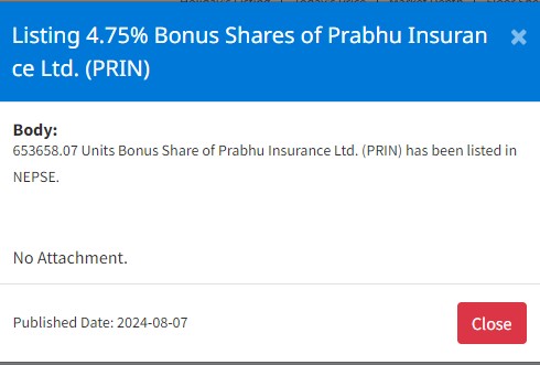 काठमाडौं । प्रभु इन्स्योरेन्स कम्पनीको बोनश शेयर नेप्सेमा थपिएको छ । कम्पनीको ६ लाख ५३ हजार ६५८ दशमलव ०७ कित्ता शेयर नेप्सेमा सूचिकृत भएको छ । कम्पनीको ४ दशलमव ७५ प्रतिशत बोनश शेयर सूचिकृत भएको हो ।