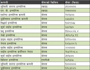 त्यसैगरी एभरेष्ट इन्स्योरेन्स, प्रुडेन्सियल इन्स्योरेन्स, सिद्धार्थ इन्स्योरेन्स, सुर्या लाईफ इन्स्योरेन्स, प्रभु इन्स्योरेन्स, नेको इन्स्योरेन्स, प्राइम लाईफ इन्स्योरेन्स, नेपाल इन्स्योरेन्स, गुराँस लाईफ इन्स्योरेन्स, लाईफ इन्स्योरेन्स कर्पोरेशन नेपाल, सुर्या लाईफ इन्स्योरेन्सको शेयर नेप्सेमा थप भएको हो ।