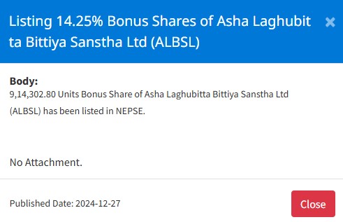 काठमाडौं । नेप्सेमा एक कम्पनीको बोनश शेयर सूचिकृत भएको छ । नेप्सेमा आज आशा लघुवित्त वित्तीय संस्थाको १४ दशलमव २५ प्रतिशत बोनश शेयर वापत ९ लाख १४ हजार ३०२ दशलमव ८० कित्ता बोनश शेयर सूचिकृत भएको हो ।