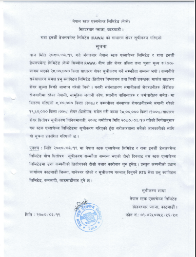 कम्पनीको स्टक सिम्बोल आरएडब्लुए (रावा) रहेको छ । त्यस्तै कम्पनीले सूचिकरणपश्चात दिनुपर्ने आरटीएस सेवा काठमाडौंको कमलादीस्थित प्रभु क्यापिटल लिमिटेडबाट हुने जनाएको छ ।