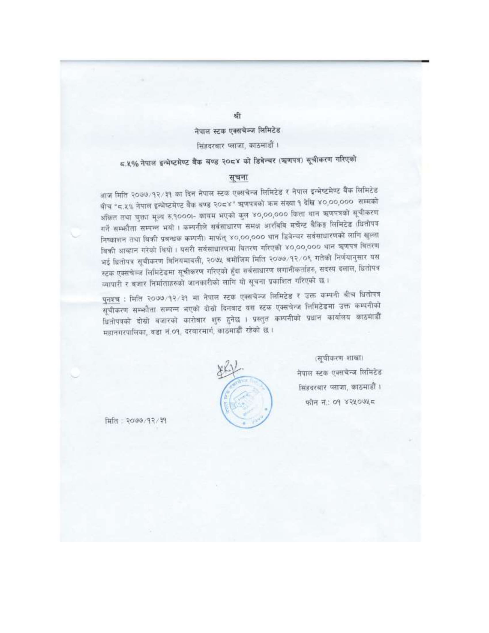 काठमाडौं । नेप्सेमा नेपाल इन्भेष्टमेन्ट बैंक लिमिटेड र मञ्जुश्री फाइनान्स लिमिटेडको ऋणपत्र सूचिकृत भएको छ । नेपाल इन्भेष्टमेन्ट बैंक लिमिटेडको ‘८ दशमलव ५ प्रतिशत नेपाल इन्भेष्टमेन्ट बैंक बण्ड २०८४’ को ४० लाख कित्ता ऋणपत्र सूचिकृत भएको हो ।