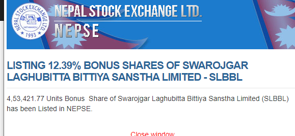 त्यसैगरी स्वरोजगार लघुवित्तको ४ लाख ५३ हजार ४२१ दशमलव ७७ कित्ता बोनश शेयर सूचीकृत भएको छ । कम्पनीको गत फागुन २९ गते सम्पन्न वार्षिक साधारण सभाबाट पारित १२ दशमलव ३९ प्रतिशत बोनश शेयर सूचीकृत भएको हो ।