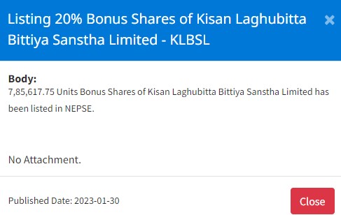 किसान लघुवित्तको २० प्रतिशत दरका कुल ७ लाख ८५ हजार ६१७ कित्ता बोनश शेयर र सिभिल बैंकको ५ प्रतिशत दरका कुल ४५ लाख ३७ हजार ९२१ कित्ता बोनश शेयर सूचिकृत भएको हो । उक्त बोनश शेयर सम्बन्धित शेयरधनीहरुको हितग्राही खातामा जम्मा भएपछि धितोपत्र दोस्रो बजारमा कारोबार हुनेछ ।