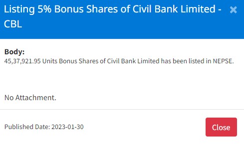किसान लघुवित्तको २० प्रतिशत दरका कुल ७ लाख ८५ हजार ६१७ कित्ता बोनश शेयर र सिभिल बैंकको ५ प्रतिशत दरका कुल ४५ लाख ३७ हजार ९२१ कित्ता बोनश शेयर सूचिकृत भएको हो । उक्त बोनश शेयर सम्बन्धित शेयरधनीहरुको हितग्राही खातामा जम्मा भएपछि धितोपत्र दोस्रो बजारमा कारोबार हुनेछ ।