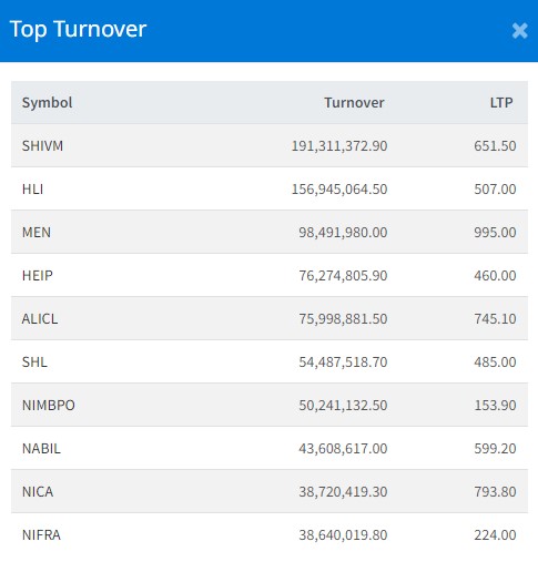 आज दिनभरिमा २८६ कम्पनीको ७१ लाख ८४ हजार २५४ कित्ता शेयर किनबेच हुँदा २ अर्ब ३७ करोड ६४ लाख २७ हजार रुपैयाँको शेयर कारोबार भएको छ । आज सबैभन्दा धेरै शिवम् सिमेन्टको १९ करोड १३ लाख रुपैयाँको शेयर कारोबार भएको छ । हिमालयन लाइफको १५ करोड ६९ लाख रुपैयाँको शेयर कारोबार भएको छ । माउन्टेन इनर्जीको ९ करोड ८४ लाख रुपैयााको शेयर कारोबार भएको छ ।