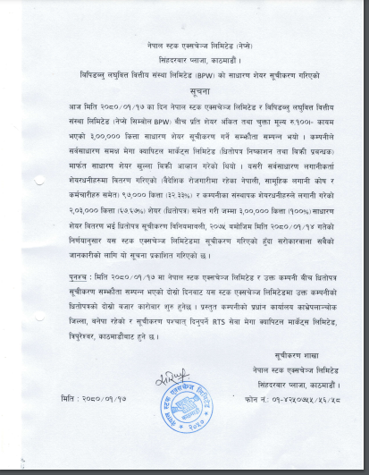 साथै शेयर सूचीकरणपश्चात् दिनुपर्ने आरटीएस सेवा मेगा क्यापिटल मार्केट्स लिमिटेडले दिने कम्पनीले जनाएको छ । बिपीडब्लु लघुवित्तको BPW सिम्बलबाट कारोबार हुने छ