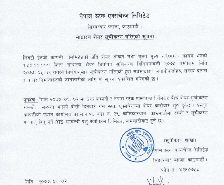 काठमाडौं । नेपाल स्टक एक्सचेन्ज (नेप्से) मा आज लिवर्टी इनर्जीको साधारण शेयर (आइपिओ) सूचिकृत भएको छ ।नेप्सेमा शुक्रबार कम्पनीको १ करोड ५० लाख कित्ता साधारण शेयर (आइपिओ) सूचिकृत भएको हो ।