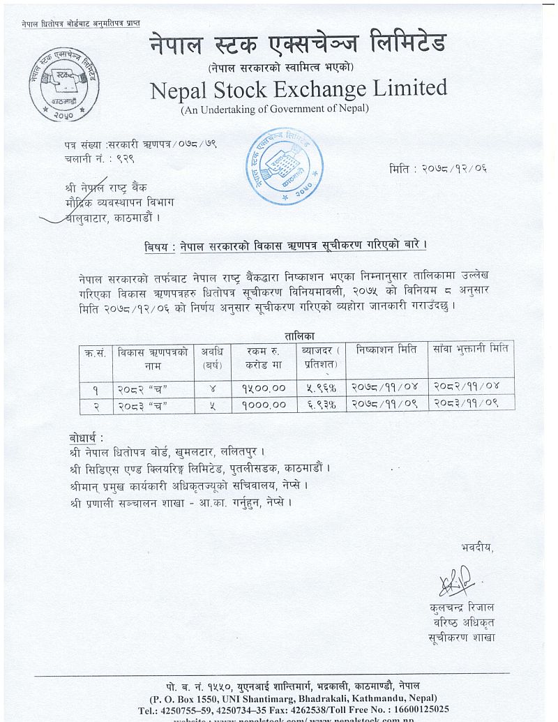 २०८२ “च” नामक विकास ऋणपत्र चार वर्षे अवधिका लागि १५ अर्ब रुपैयाँ बराबरको र २०८३ “च” नामक विकास ऋणपत्र ५ वर्ष अवधिको लागि १० अर्ब रुपैयाँ बराबरका गरी कुल २५ अर्ब रुपैयाँ बराबरको विकास ऋणपत्र सूचिकृत भएको हो ।