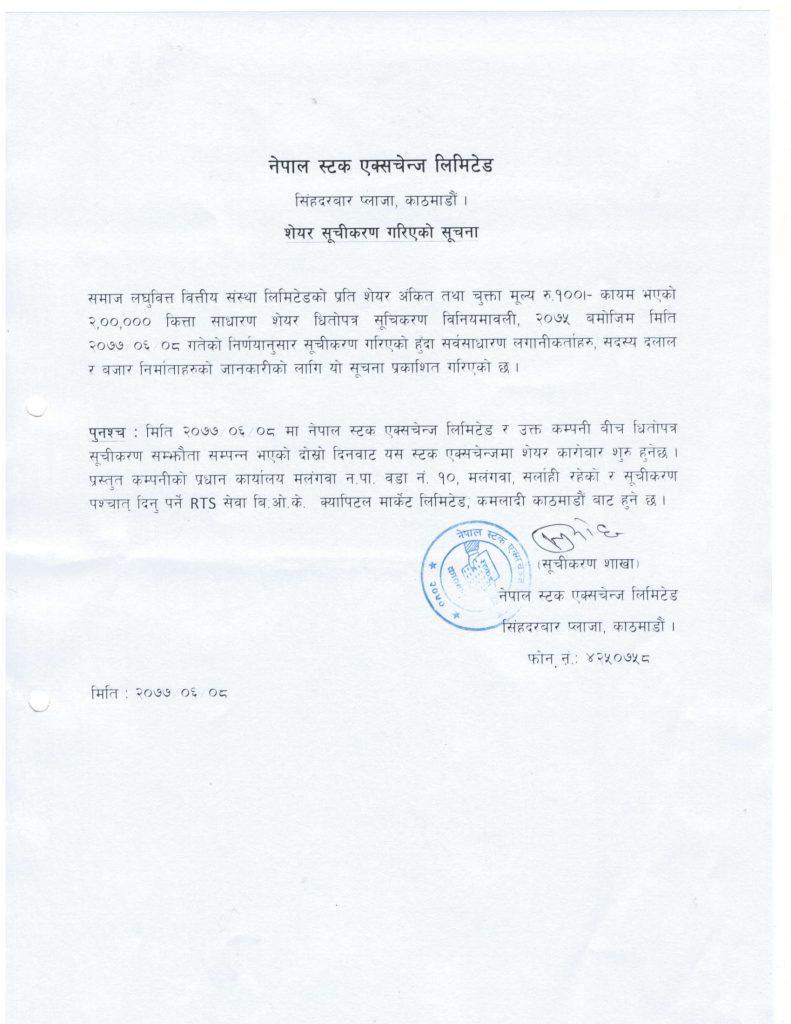 काठमाडौं । नेपाल स्टक एक्सचेन्ज (नेप्से) मा आज समाज लघुवित्त को साधारण शेयर (आइपिओ) सूचिकृत भएको छ ।नेप्सेमा लघुवित्तको २ लाख कित्ता साधारण शेयर (आइपिओ) सूचिकृत भएको हो । त्यसैगरी, हालका लागि मर्जको कारण लघुवित्तको कारोबार भने रोक्का गरिएको छ ।