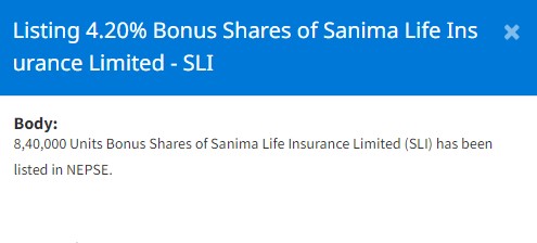 काठमाडौं । नेप्सेमा आज सानिमा लाइफ इन्स्योरेन्स कम्पनीको शेयर सुचिकृत भएको छ । आज कम्पनीको ८ लाख ४० हजार कित्ता बोनस शेयर सुचिकृत भएको हो ।