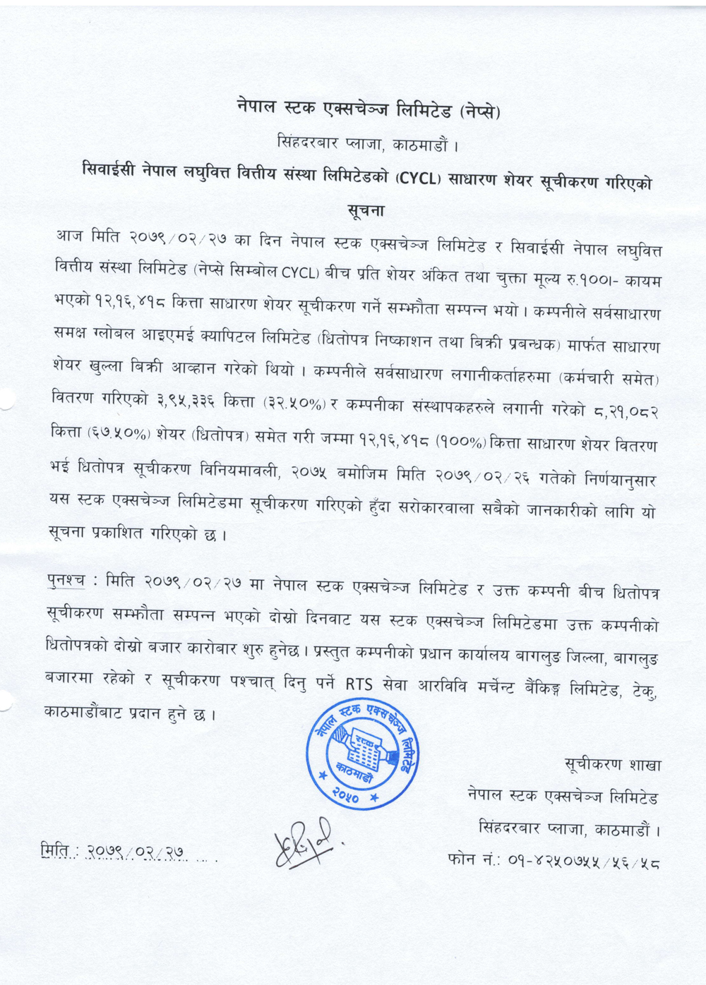 काठमाडौं । नेपाल स्टक एक्सचेञ्जमा सिवाईसी नेपाल लघुवित्तको आइपीओ सूचिकृत भएको छ । नेप्से र कम्पनीबीच आज सुचिकरण सम्बन्धी सम्झौता भएसँगै आइपीओ सूचिकृत भएको हो । कम्पनीको आइपीओ सिवाइसिएल’ सिम्बोलबाट कारोबारमा आउनेछ । लघुवित्तको १०० रुपैयाँ अंकित दरको १२ लाख १६ हजार ४१८ कित्ता शेयर सूचिकृत भएको हो ।