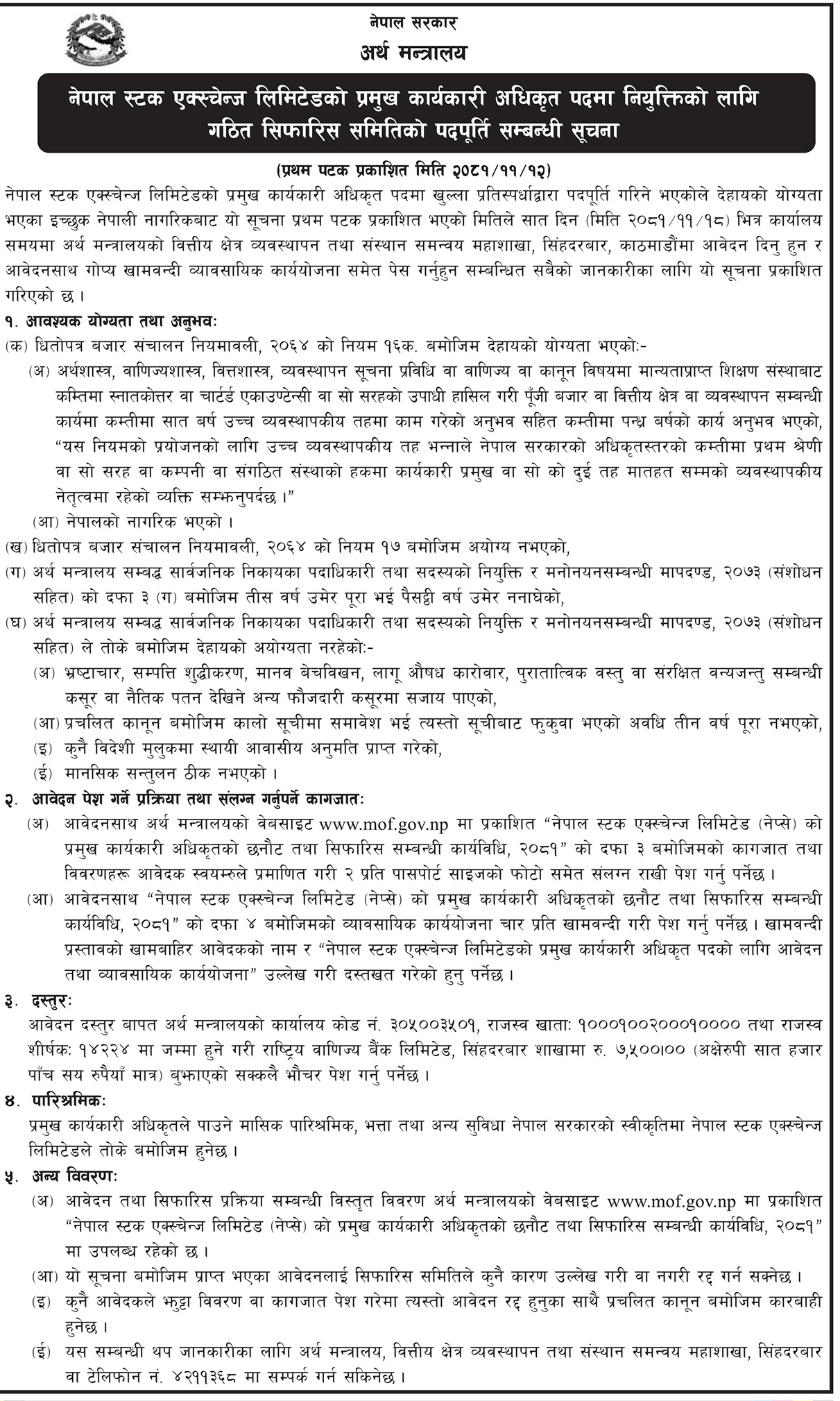 नेप्सेमा खुला प्रतिस्पर्धाबाट सीईओ नियुक्तिका लागि दरखास्त आह्वान गरिएको हो। इच्छुक र योग्य नागरिकले ७ दिन फागुन १८ गतेभित्र कार्यालय समयमा अर्थ मन्त्रालयको वित्तीय क्षेत्र व्यवस्थापन तथा संस्थान समन्वय महाशाखामा आवेदन दिनुपर्नेछ।