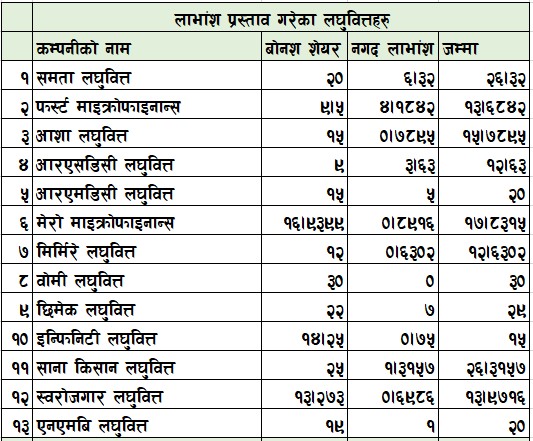त्यस्तै, छिमेक लघुवित्त वित्तीय संस्थाले २२ प्रतिशत बोनश शेयर र ७ प्रतिशत नगद लाभांश गरी कुल २९ प्रतिशत लाभांश आफ्ना शेयरधनीलाई दिने घोषणा गरेको छ । त्यस्तै, समता लघुवित्त वित्तीय संस्थाले आफ्ना शेयरधनीलाई कुल २६ दशमलव ३२ प्रतिशत लाभांश दिने घोषणा गरेको छ ।