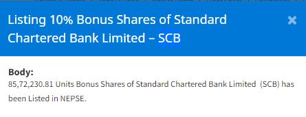काठमाडौं । नेपाल स्टक एक्सचेञ्जमाआज फागुन ४ गते बुधबार स्ट्यान्डर्ड चार्टर्ड बैंक लिमिटेडको बोनश शेयर सूचिकृत भएको छ । स्टकका अनुसार बैंकको १० प्रतिशत बोनश बापतको ८५ लाख ७२ हजार २ सय ३० दशमलब ८१ कित्ता शेयर नेप्सेमा सूचिकृत भएको हो ।
