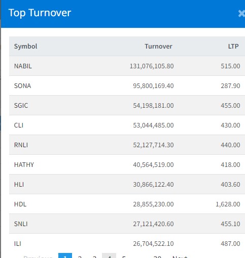 आज १ अर्ब ३४ करोड ८३ लाख रुपैयाँको शेयर कारोबार हुँदा नविल बैंकको सर्वाधिक शेयर कारोबार भएको छ । आज यस बैंकको १३ करोड १० लाख रुपैयाँको शेयर कारोबार भएको छ । आज सोनापुर मिनरल्सको ९ करोड ५८ लाख रुपैयाँको शेयर कारोबार भएको छ । सानिमा जिआइसी इन्स्योरेन्सको ५ करोड ४१ लाख रुपैयाँको शेयर कारोबार भएको छ । सिटिजन लाइफ इन्स्योरेन्सको ५ करोड ३० लाख रुपैयाँको शेयर कारोबार भएको छ ।