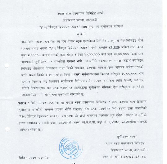 काठमाडौं । आज नेप्सेमा कुमारी बैंकको ३० लाख कित्ता डिबेञ्चर सूचिकृत भएको छ । आज कम्पनीले १० वर्ष अवधि भएको ११ प्रतिशत केबिएल डिबेञ्चर २०८९ नामक ऋणपत्र सूचिकृत गराएको हो । अब यस डिबेञ्चर मंगलवारदेखि धितोपत्रको दोस्रो बजारमा कारोबारमा आउनेछ ।