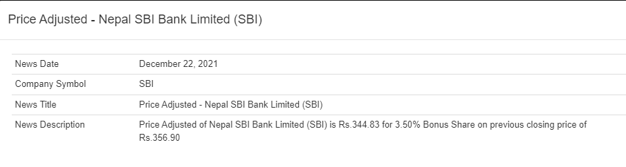 नेप्सेले एनएमबि बैंकको १२ दशमलव ५० प्रतिशत र नेपाल एसबिआई बैंकको ३ दशमलव ५० प्रतिशत बोनश शेयर पछिको मुल्य समायोजन गरेको हो। त्यसैगरी छिमेक लघुवित्तको २७ प्रतिशत र गणपति लघुवित्तको १९ प्रतिशत बोनश शेयर पछिको मुल्य समायोजन गरेको हो। समायोजन पश्चात एनएमबि बैंकको शेयर मूल्य ३३६ रुपैयाँ ३६ पैसा, एसबिआई बैंकको ३४४ रुपैयाँ ८३ पैसा, छिमेक लघुवित्तको १ हजार २४० रुपैयाँ ८ पैसा र गणपति लघुवित्तको १ हजार १७४ रुपैयाँ ७९ पैसा कामय भएको छ।