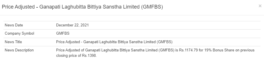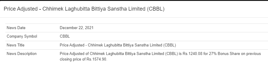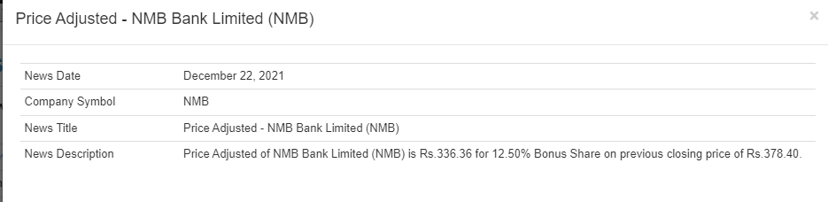 नेप्सेले एनएमबि बैंकको १२ दशमलव ५० प्रतिशत र नेपाल एसबिआई बैंकको ३ दशमलव ५० प्रतिशत बोनश शेयर पछिको मुल्य समायोजन गरेको हो। त्यसैगरी छिमेक लघुवित्तको २७ प्रतिशत र गणपति लघुवित्तको १९ प्रतिशत बोनश शेयर पछिको मुल्य समायोजन गरेको हो। समायोजन पश्चात एनएमबि बैंकको शेयर मूल्य ३३६ रुपैयाँ ३६ पैसा, एसबिआई बैंकको ३४४ रुपैयाँ ८३ पैसा, छिमेक लघुवित्तको १ हजार २४० रुपैयाँ ८ पैसा र गणपति लघुवित्तको १ हजार १७४ रुपैयाँ ७९ पैसा कामय भएको छ।