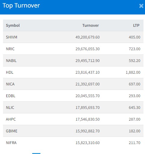 आज सबैभन्दा धेरै शिवम् सिमेन्टको शेयर कारोबार भएको छ । आज कम्पनीको ४ करोड ९२ लाख रुपैयाँको शेयर कारोबार भएको छ । नेपाल पुनर्बीमा कम्पनीको २ करोड ९६ लाख रुपैयाँको शेयर कारोबार भएको छ । नविल बैंकको २ करोड ९४ लाख रुपैयाँको शेयर कारोबार भएको छ । हिमालयन डिष्टिलरीको २ करोड ३८ लाख रुपैयाँको शेयर कारोबार भएको छ ।