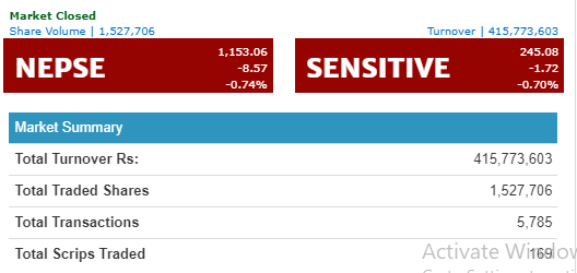 साताको पहिलो दिन नेप्से ८ दशमलव ५७ अङ्कले घटेर ११५३ दशमलव ०६ अङ्कमा बन्द भएको छ । कारोबार रकम ४१ करोड ५७ लाख रुपैयाँ पुगेको छ ।