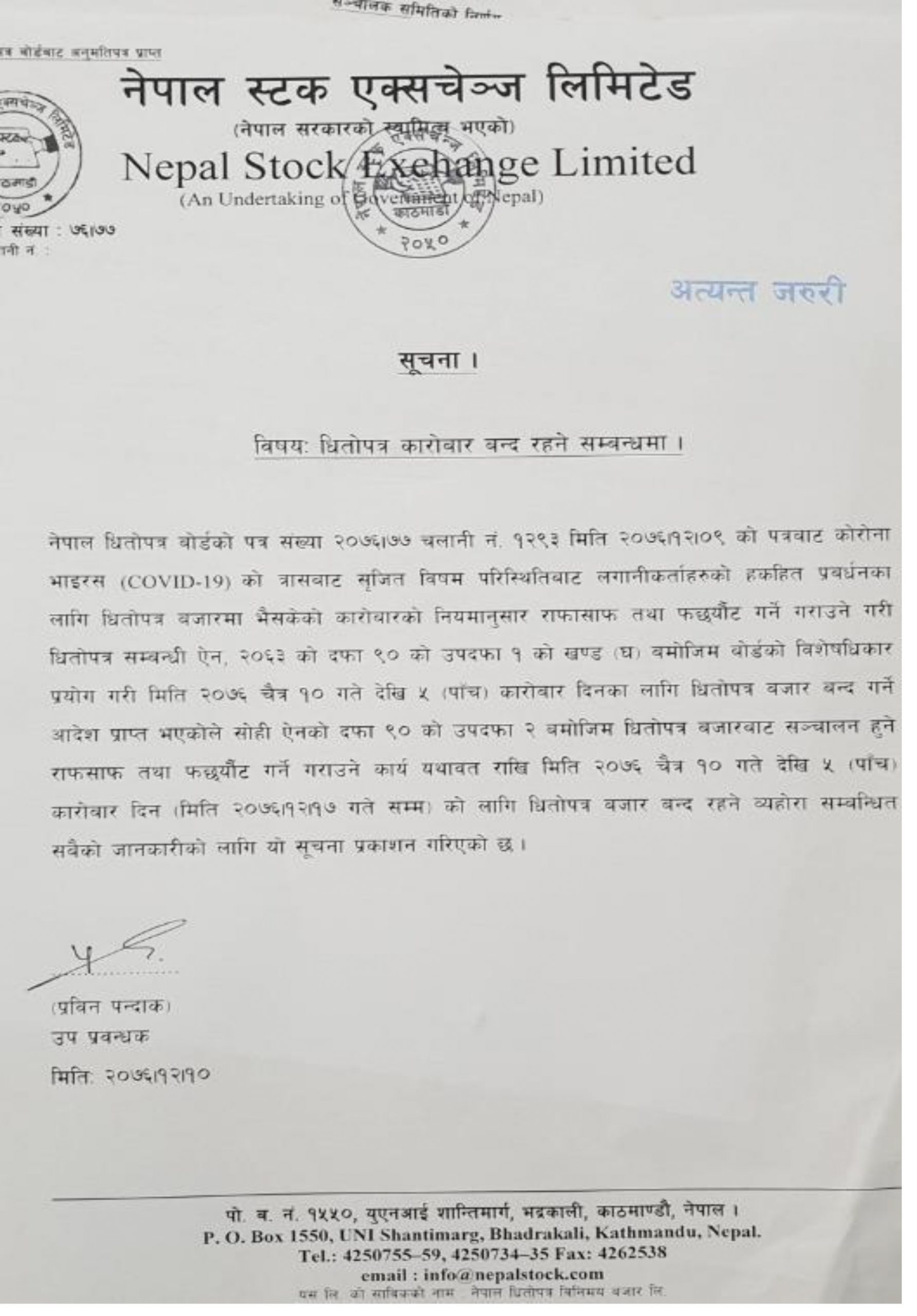 कोरोनाको कारण शेयर कारोबारमा लगातार गिरावट आएपछि आइतबारदेखि नै बजार बन्द गर्नेबारेमा सेबोन, नेप्से र लगानीकर्ताबीच सहमति भएको भएपनि सेबोनको पत्र प्राप्त नभएपछि नेप्सेले आइतबार कारोबार सुचारु गरेको थियो ।