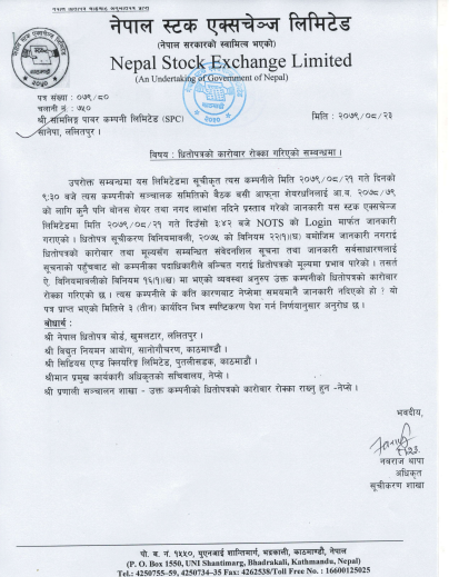 नेप्सेले कम्पनीलाई यसबारे ३ दिनभित्रमा स्पष्टीकरण पेस गर्न आग्रह गर्दै शेयर कारोबार रोक्का गरेको हो ।